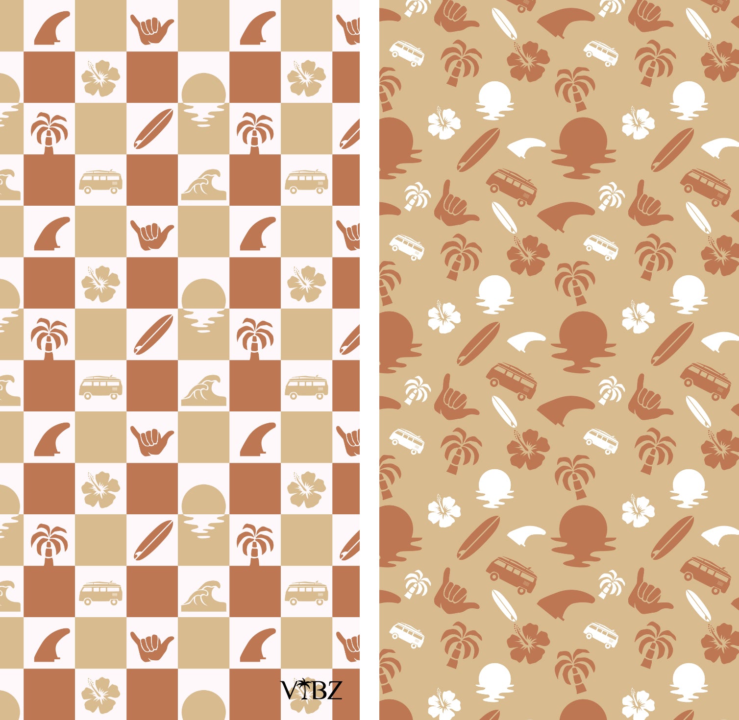 ● Shakas Design: Showcases a dynamic print with shaka hand waves, a stunning sunset, a classic retro Kombi van, and a bright hibiscus flower, capturing the essence of laid-back beach vibes and nostalgic charm.